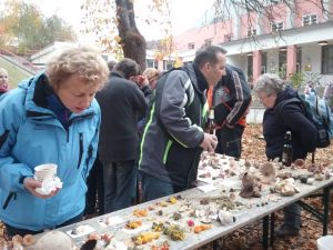 ThAM-Mitglied Sven Heinz, der sich näher mit Dung-Pilzen befasst, vermeldete 8 coprophile Ascomyceten auf Kuhfladen, Hasen- und Mäuselosung. Aber auch die Mykophagen unter uns waren sehr zufrieden, denn es gab auch noch reichlich Speisepilze, vor allem massenhaft Riesen-Schirmlinge (M. excoriata und fuliginosa) auf der Weide sowie Steinpilze, Maronen und Edelreizker. Insgesamt erfassten wir etwa 100 Pilzarten und einige Flechtenarten, wie aus der Fundliste ersichtlich ist. Die abschließende Fundauswertung wurde auf Vorschlag des einheimischen Pilzfreundes Wilfried Reichenbächer in den Garten des Hauses des Volkes Probstzella, des bekannten Bauhaus-Hotels, verlegt, der anlässlich der dortigen Kirmes gut besucht war. Dadurch wurde aus der eigentlich internen Fundbesprechung eine zwar spontane, aber gelungene öffentliche Pilzausstellung der ThAM, die zahlreiche Besucher anzog. Besonders lobend über unsere Arbeit äußerte sich der anwesende Saalfelder Landrat Marco Wolfram, was gleichzeitig auch Publicity für die Pilzberatung und die ThAM bedeutet. Somit war es ein insgesamt erfolgreicher Pilztag im Thüringer Schiefergebirge.