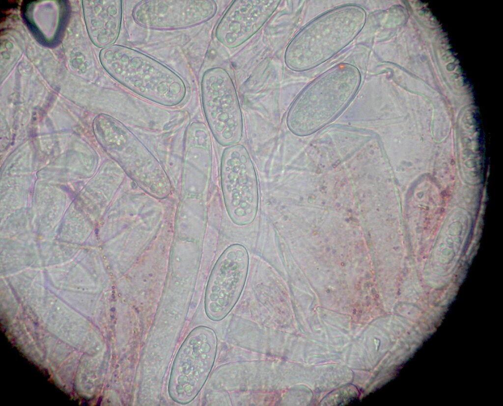 Sarcoscypha austriaca erkennt man an den stark gebogenen Basishaaren und den Sporen.